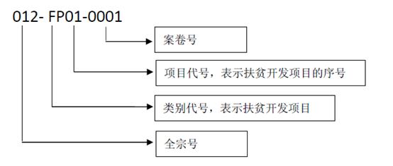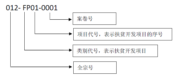 2、扶贫开发项目档案档号结构为:“全宗号-分类号(类别代号.项目代号)-案卷号”。